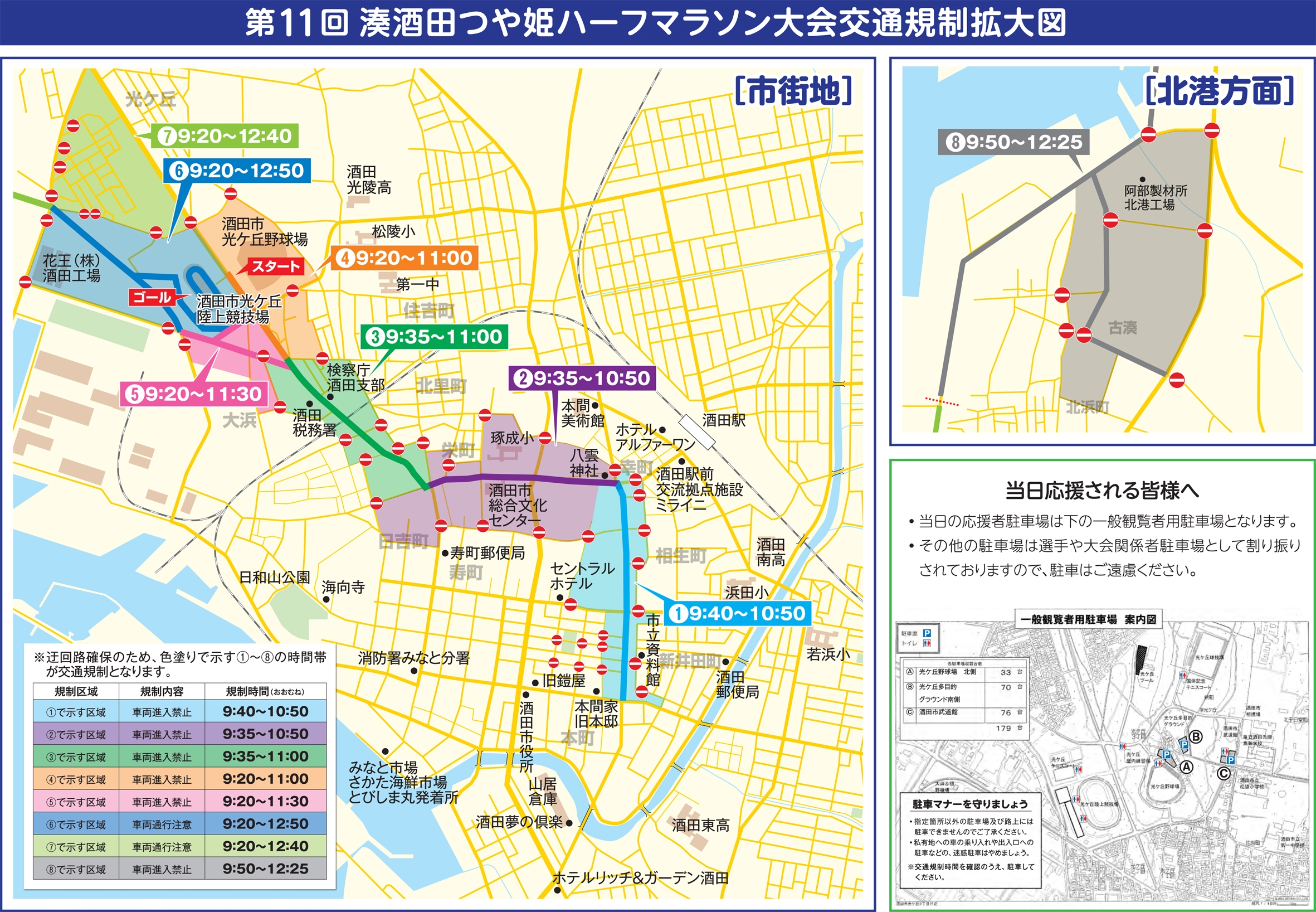 第11回酒田つや姫ハーフマラソン大会一般観覧者の駐車場は「3か所」になります。